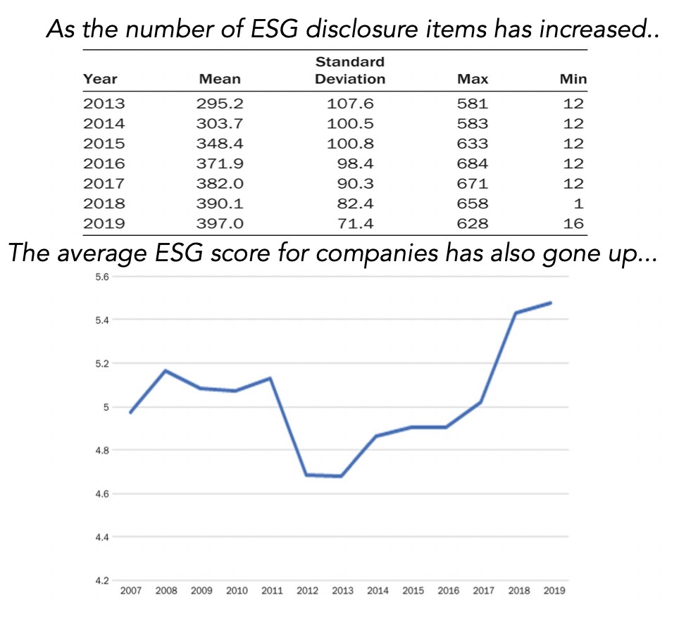 While I am sure that there will be some in the ESG community who will view this as vindication that disclosure is inducing better corporate behavior, the cynic in me sees companies learning to play the ESG game, at least as designed by services, and using the disclosure process to check boxes and up their scores. To me, the parallels to the corporate governance movement from two decades ago are uncanny, where services rushed to estimate corporate governance scores for companies, accountants, and rule writers added hundreds of pages of disclosure on corporate governance, and promises were made of a “golden age” for shareholder power