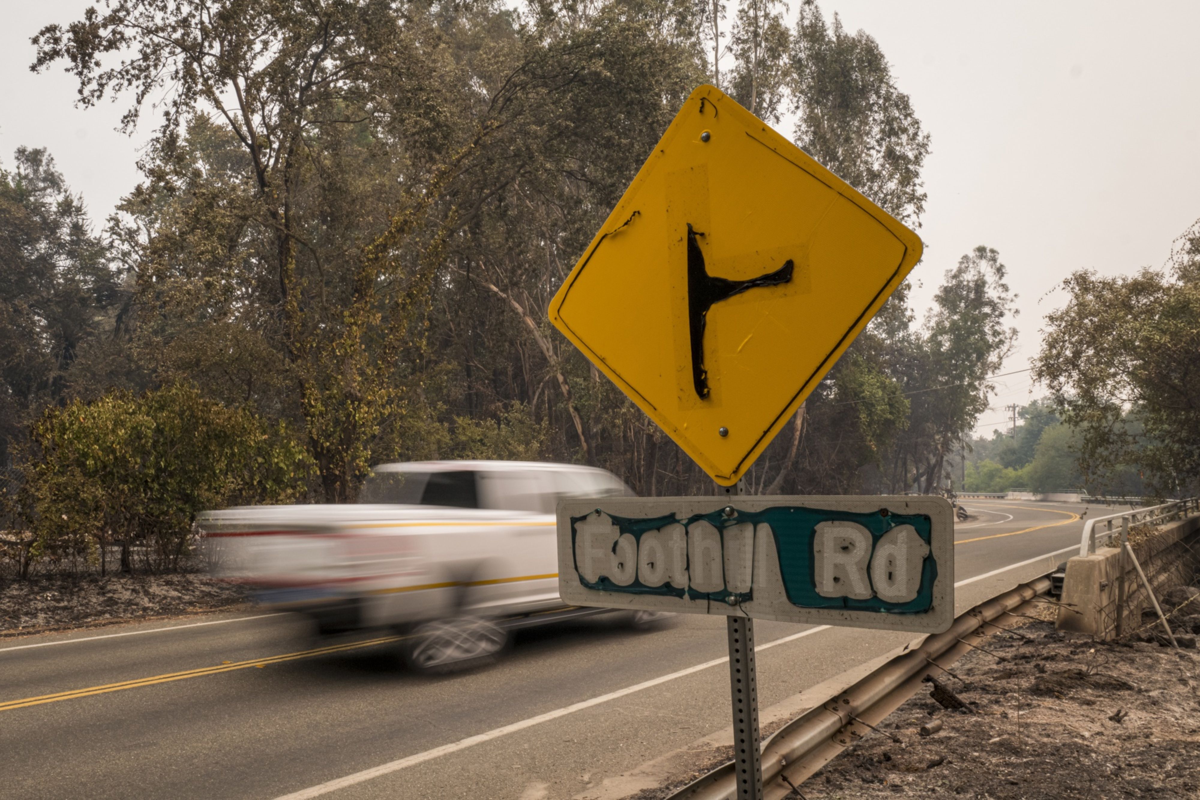 A vehicle drives past a melted road sign in Vacaville, California. Photographer: David Paul Morris/Bloomberg