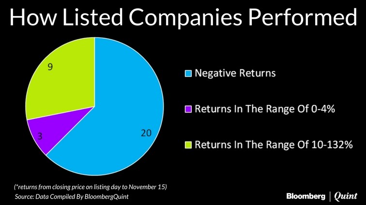 Thirty-two companies have raised nearly Rs 50,000 crore from IPOs so far this year, the highest on record. Promoters and shareholders walked away with the bulk of the gains by offloading stakes. What helped was a positive sentiment as domestic investors drove benchmark indices to record highs. Yet, more than 60 percent – 20 companies – gave negative returns since the first-day close till Nov. 15. Nine rose 10-132 percent, while three gained 0-4 percent.