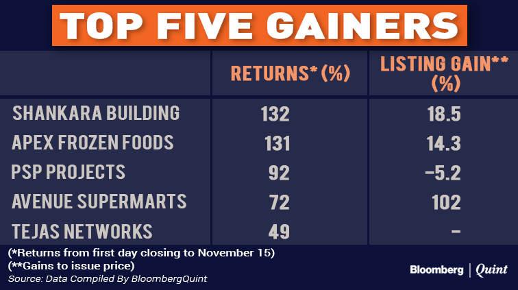 Shankara Building Products Ltd., the retailer of home improvement and building products, and shrimp exporter Apex Frozen Foods Ltd. listed at a premium of less than 20 percent to the issue price. The two have more than doubled since the first-day close.