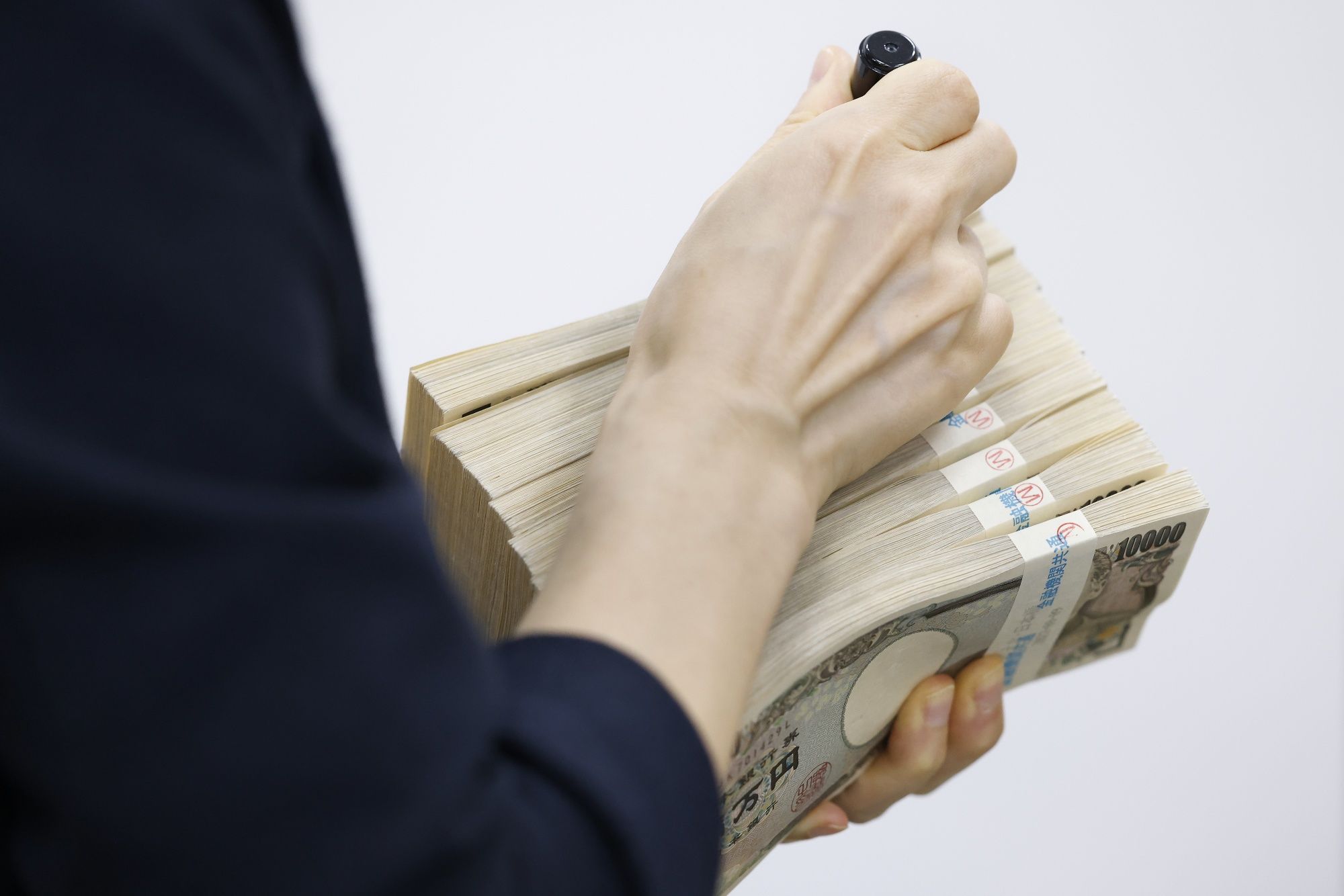 An employee handles bundles of Japanese 10,000 yen banknotes at a branch of Resona Bank Ltd. in Tokyo, Japan, on Tuesday, Aug. 9, 2022. Dollar-yen, which soared 38% from a March 2020 trough to mid-July this year, is in retreat. Photographer: Kiyoshi Ota/Bloomberg