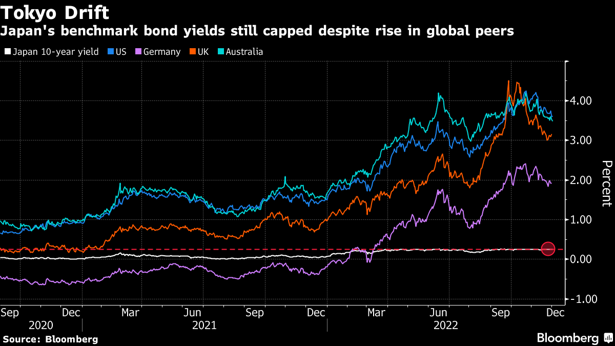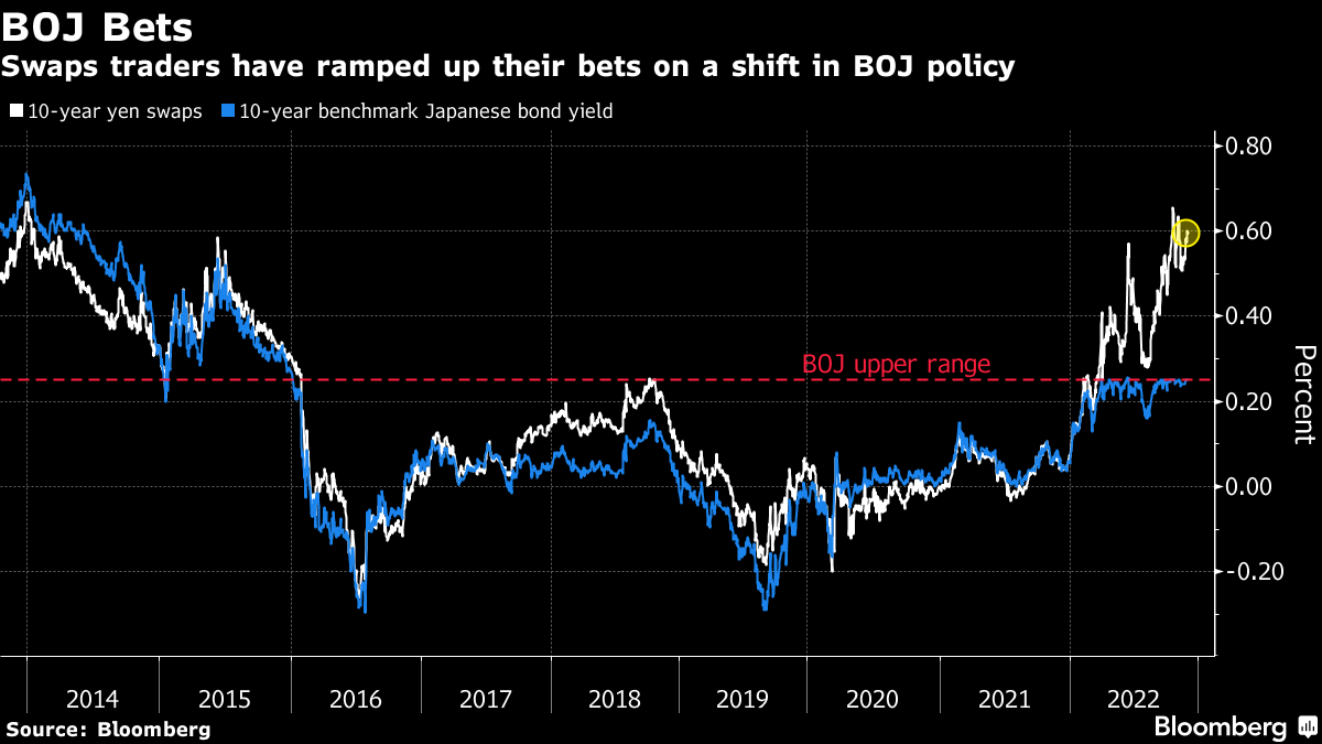 Ten-year Japanese swap rates -- which are popular with international funds -- have climbed well beyond the BOJ's 0.25% ceiling for the benchmark bond. That's a sign that traders are betting the central bank will tweak its policy of capping 10-year yields.