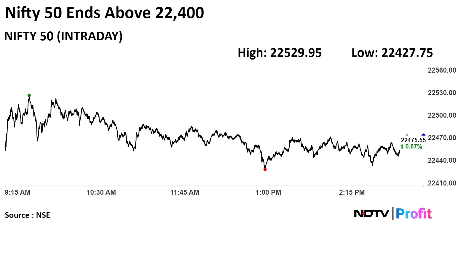 Intraday, the NSE Nifty 50 rose 0.91% to a life high of 22,529.95, and the S&P BSE Sensex rose 0.82% to a record 74,254.62.