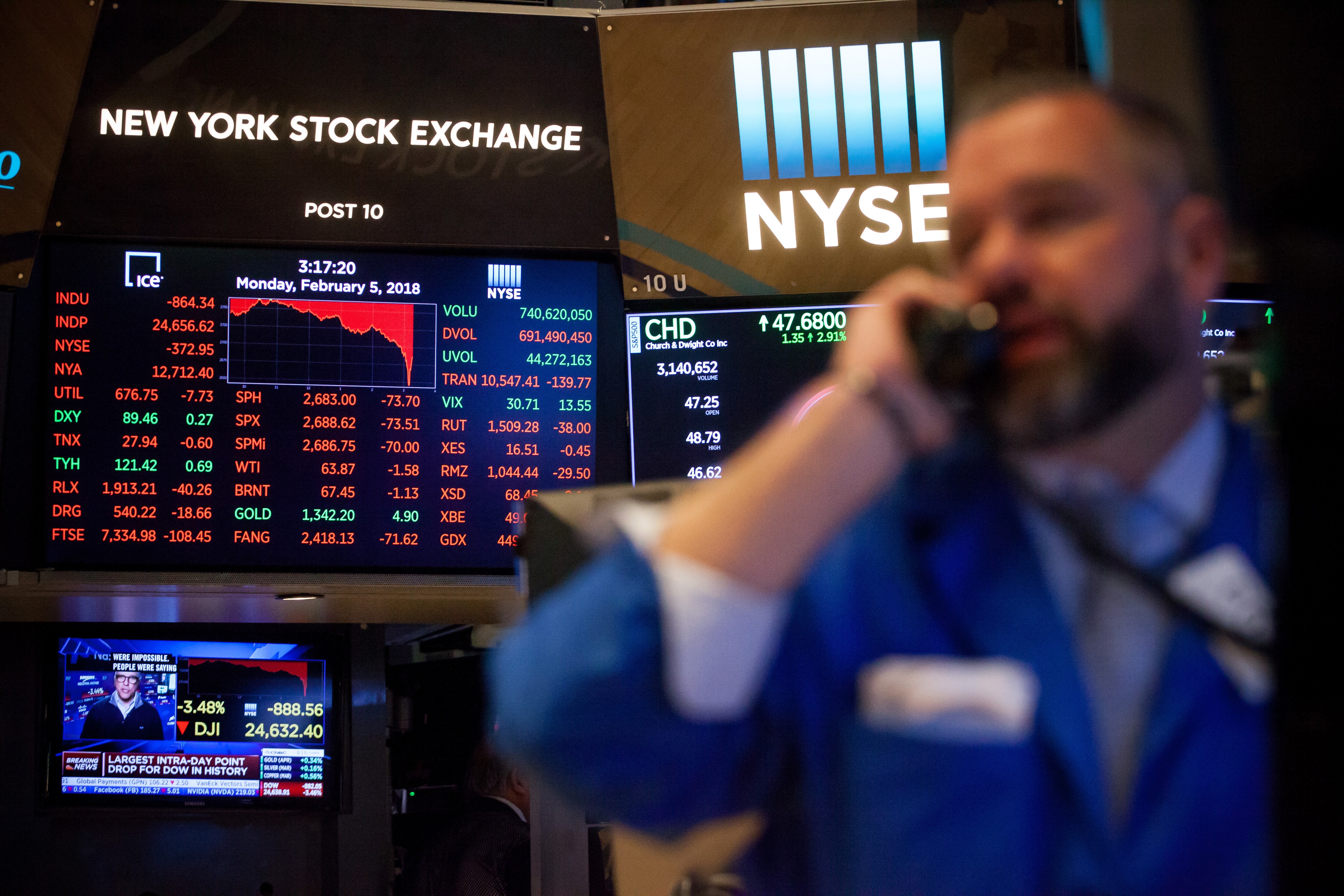 A monitor displays stock information as a trader works on the floor of the New York Stock Exchange (NYSE) in New York, U.S., on Monday, Feb. 5, 2018. (Photographer: Michael Nagle/Bloomberg)