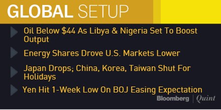 The West Texas Intermediate crude dropped below $44 per barrel towards a two-week low, amidst speculation that the global glut will expand. Libya, a member of the Organisation of Petroleum Exporting Countries, lifted curbs on sales from three ports thereby unlocking 3 lakh barrels per day. Another OPEC member Nigeria is seeking to boost exports as well.