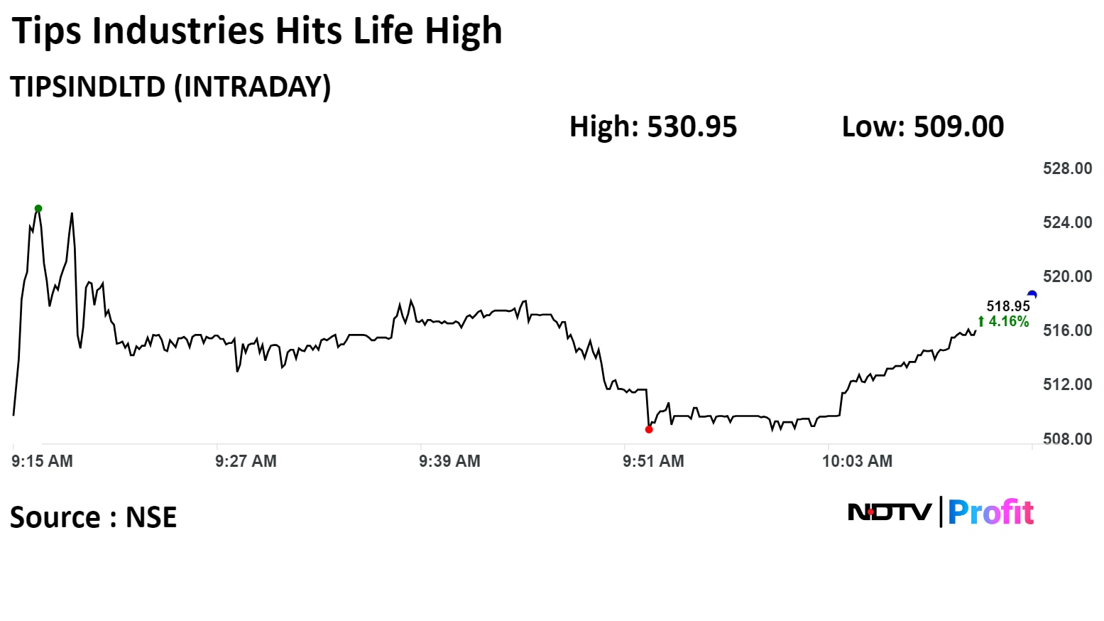 Shares of Tips Industries rose as much as 6.57%, the highest since listing on Nov. 20, 2000, before paring gains to trade 2.38% higher at 10:04 a.m. This compares to a 0.39% decline in the NSE Nifty 50.