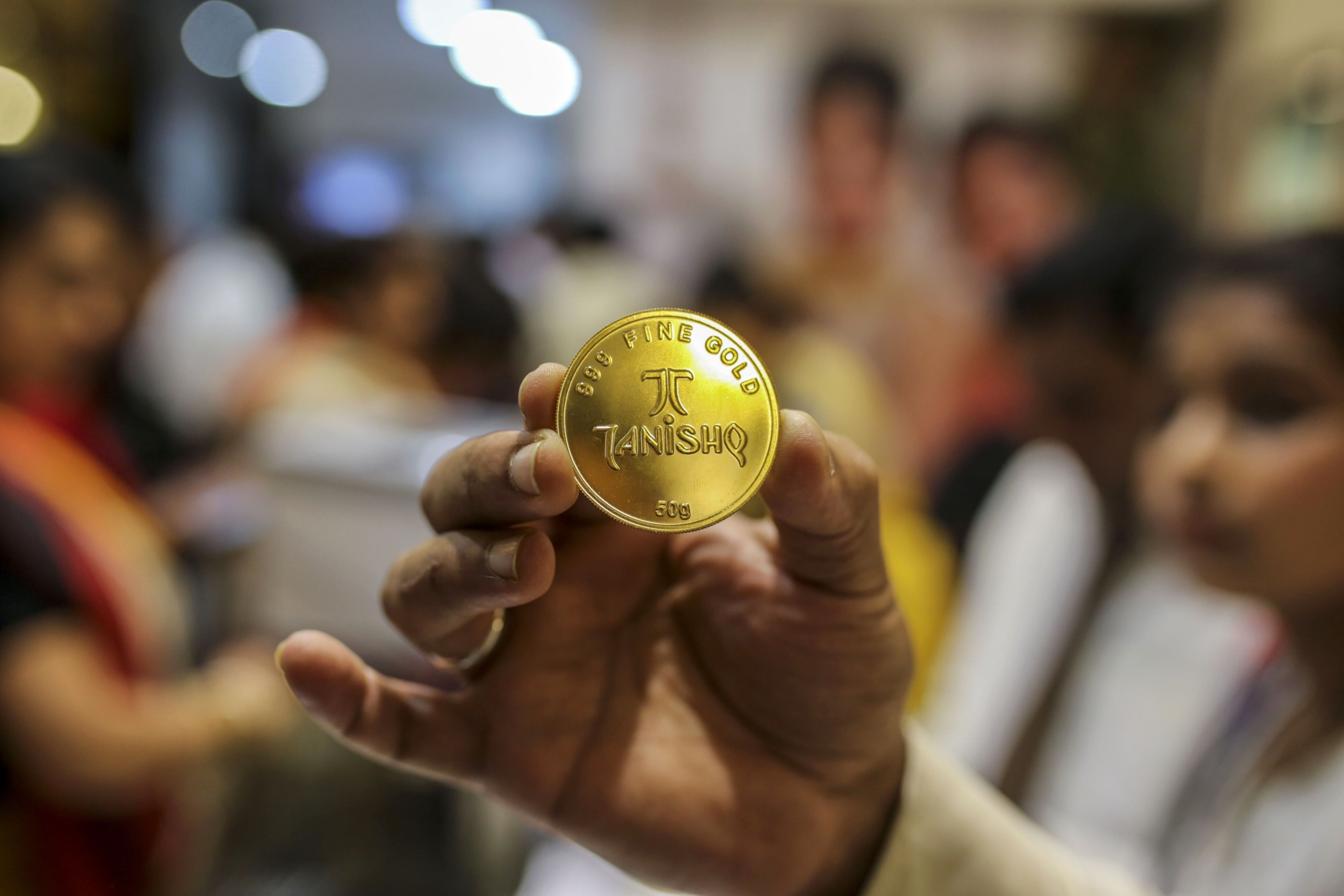 An employee holds a 50-gram gold coin for a photograph inside a Titan Co. Tanishq jewelry store in Mumbai, India. (Photographer: Dhiraj Singh/Bloomberg)