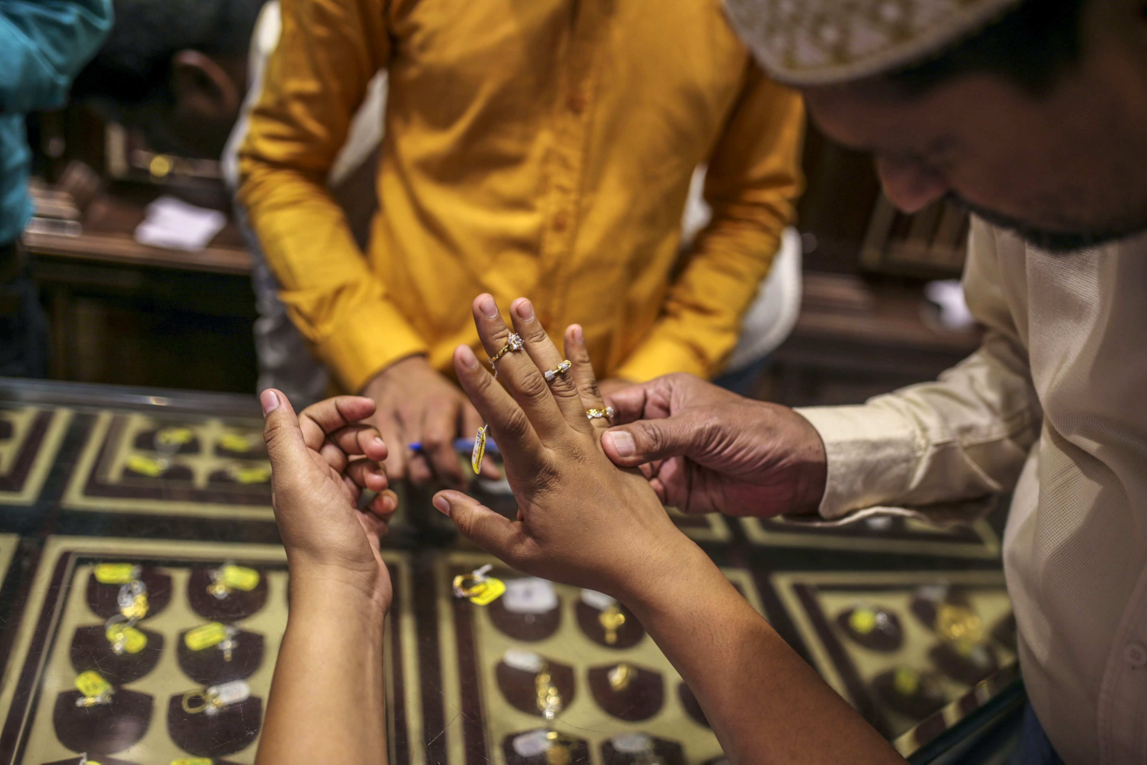 A customer tries on rings inside a Titan Co. Tanishq jewelry store in Mumbai. (Photographer: Dhiraj Singh/Bloomberg)