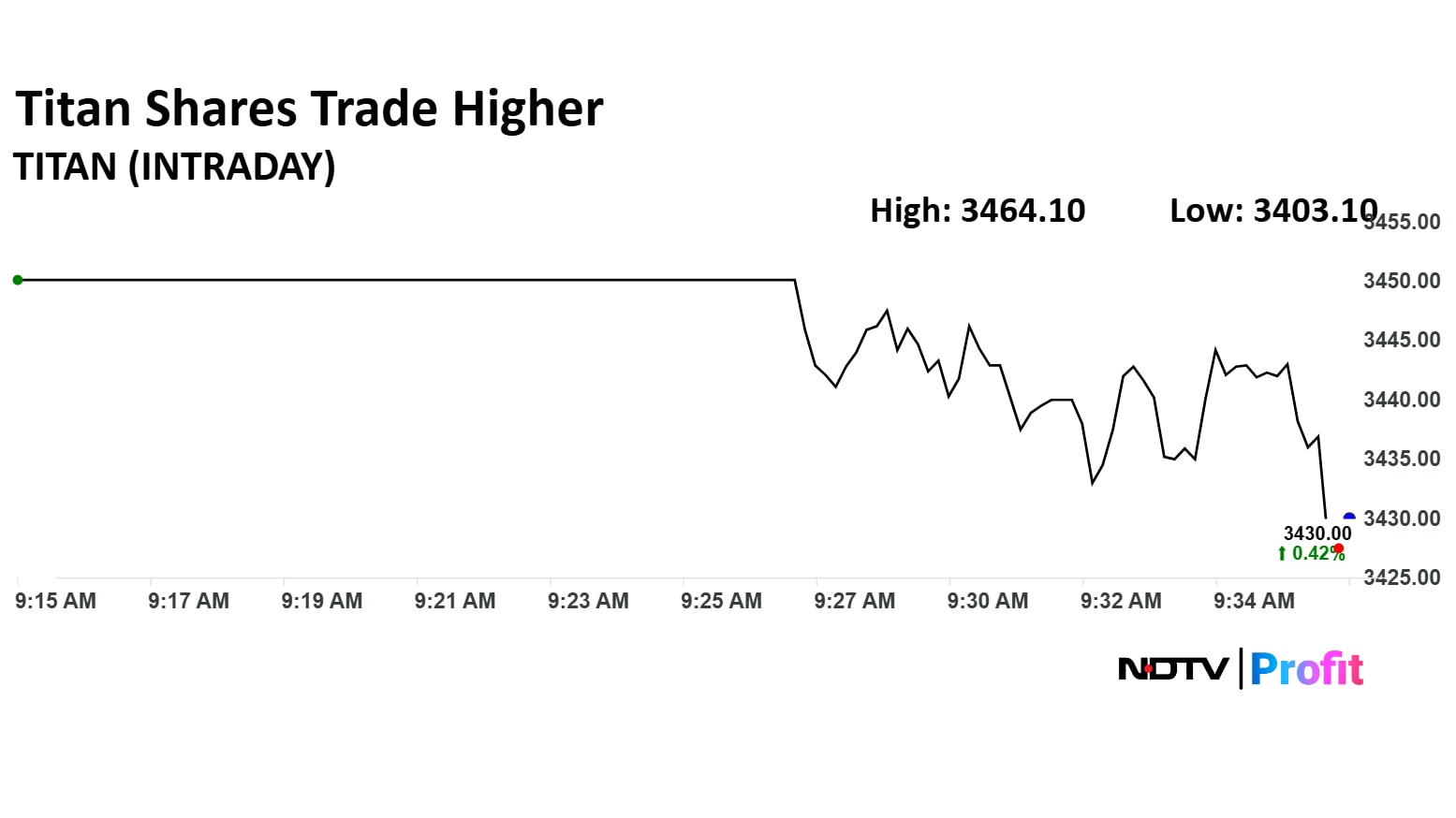 Shares of Titan rose as much as 1.26% to Rs 3,458.80 apiece. They pared gains to trade 0.42% higher at Rs 3,430 apiece, as of 9:40 a.m. This compares to a 0.34% decline in the NSE Nifty 50.