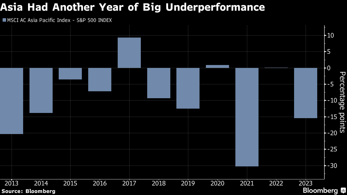 The MSCI Asia Pacific Index hugely underperformed global peers in 2023, with its 9% rise less than half the S&P 500's advance. The global backdrop now looks more favorable. The Federal Reserve's much-anticipated interest rate cuts are poised to add tailwinds while expectations are growing for Chinese equities to bottom out.
