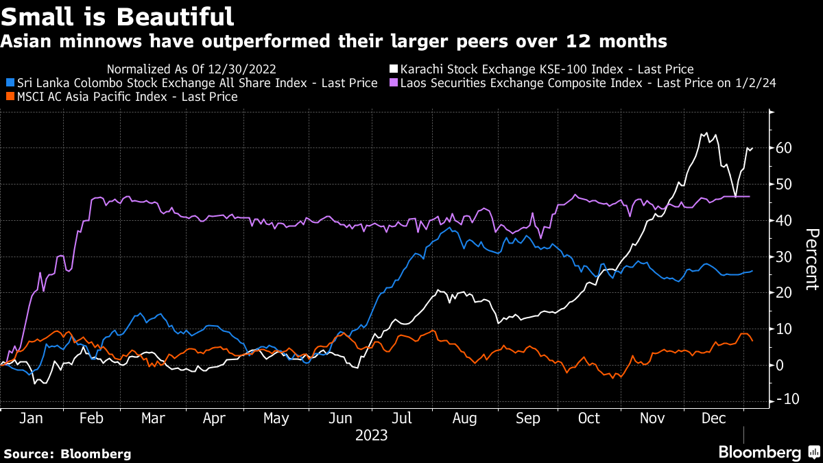 The equity benchmarks of Pakistan and Laos — a rare investment destination for many due to the markets' small size and volatility — ranked among the world's top five gauges in 2023, notching gains of more than 50%. Vietnam rose 12%.