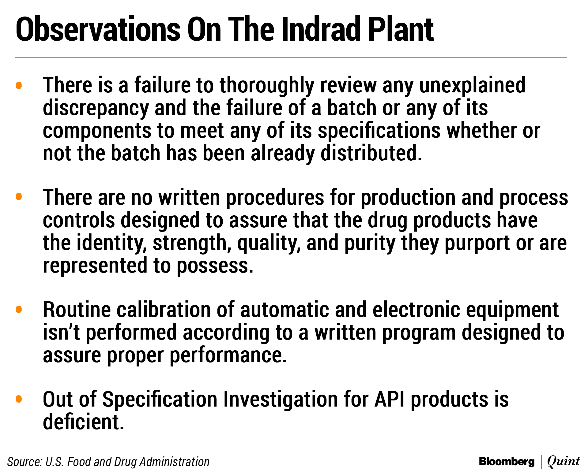 The Food and Drug Administration released on its website today the Form 483 it had issued to the plant, which was inspected between April 8 and 16, containing four observations. The plant caters to U.S.—making finished products and active pharmaceutical ingredients—and generates nearly 80 percent of the firm's revenue from the nation. The action comes barely three weeks after Torrent Pharma's plant in Dahej, Gujarat, received five observations after a similar inspection.