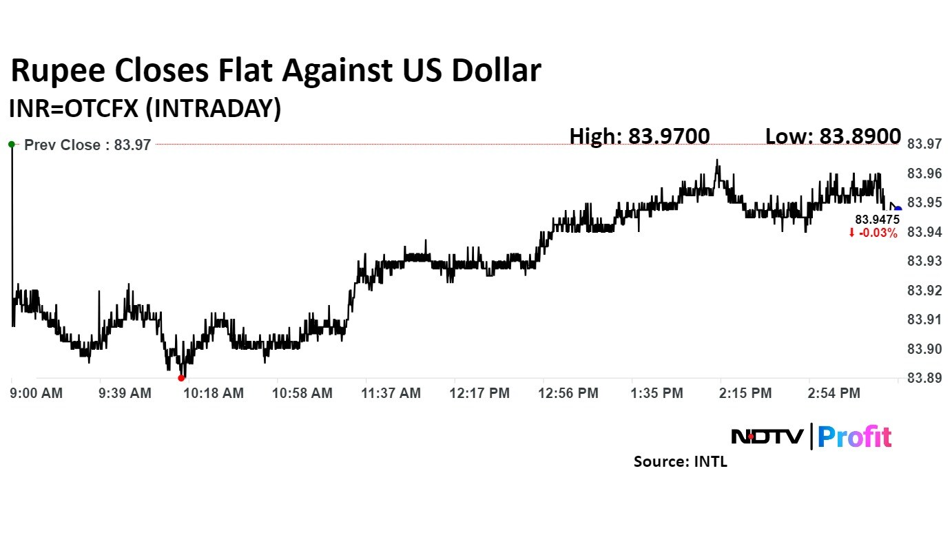The rupee closed flat after appreciating 2 paise higher from previous close to 83.95 against the US dollar. It had closed at Rs 83.97 on Tuesday.
