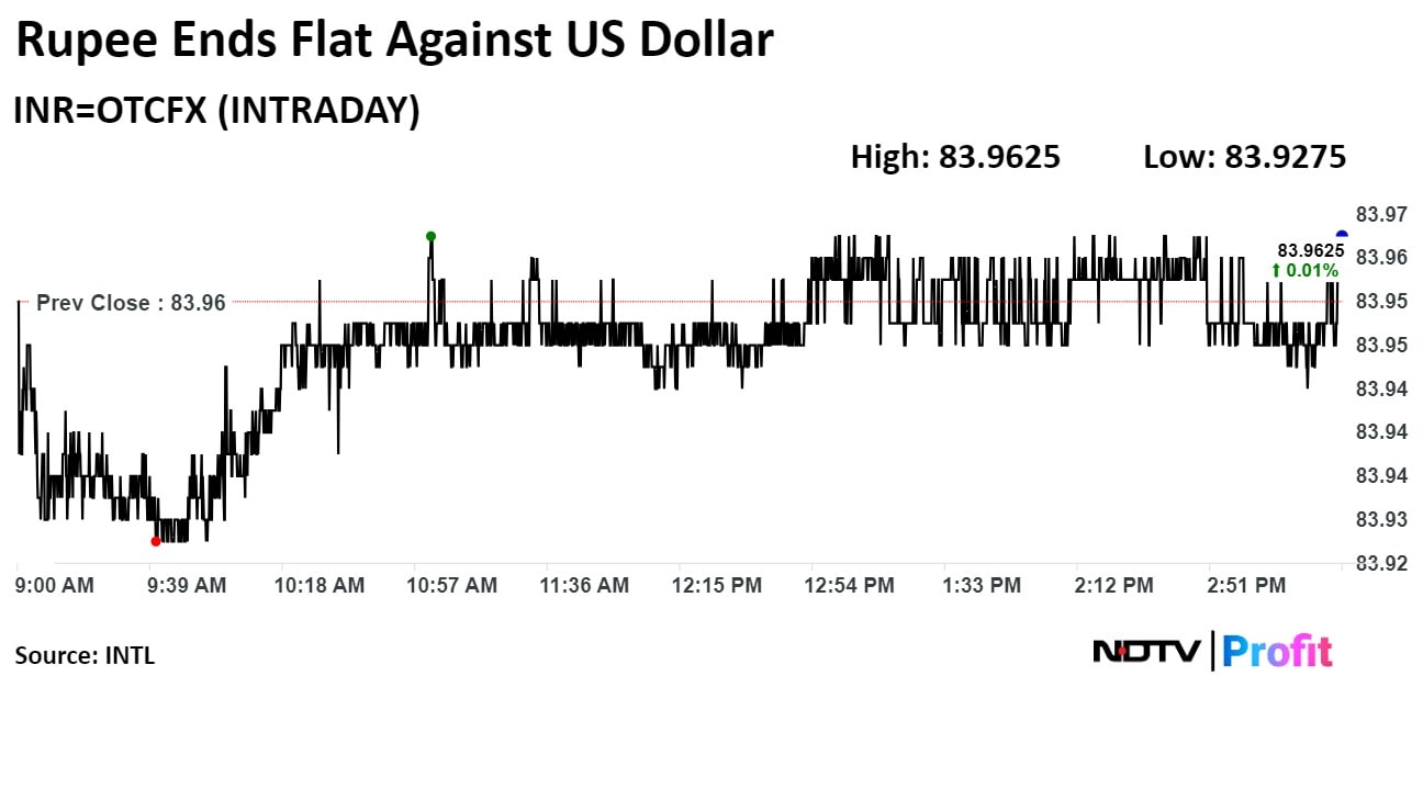 The Indian rupee closed flat after weakening to a record low of Rs 83.99 against the dollar. It had opened flat ahead of the release of the Reserve Bank of India policy statement.