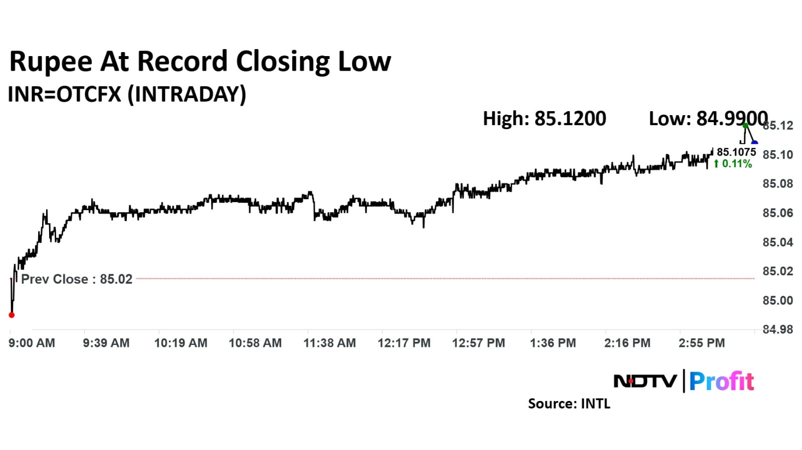 The Indian rupee weakened by 10 paise to close at a record low of 85.12 against the US dollar on Monday.