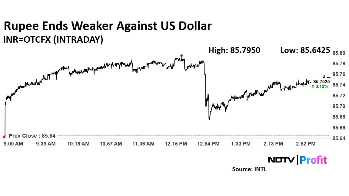 The rupee ended weaker against the US dollar on Thursday, declining by 10 paise to close at 85.75. This marks a continued weakening trend for the rupee, which has been grappling with global dollar strength and domestic demand pressures.