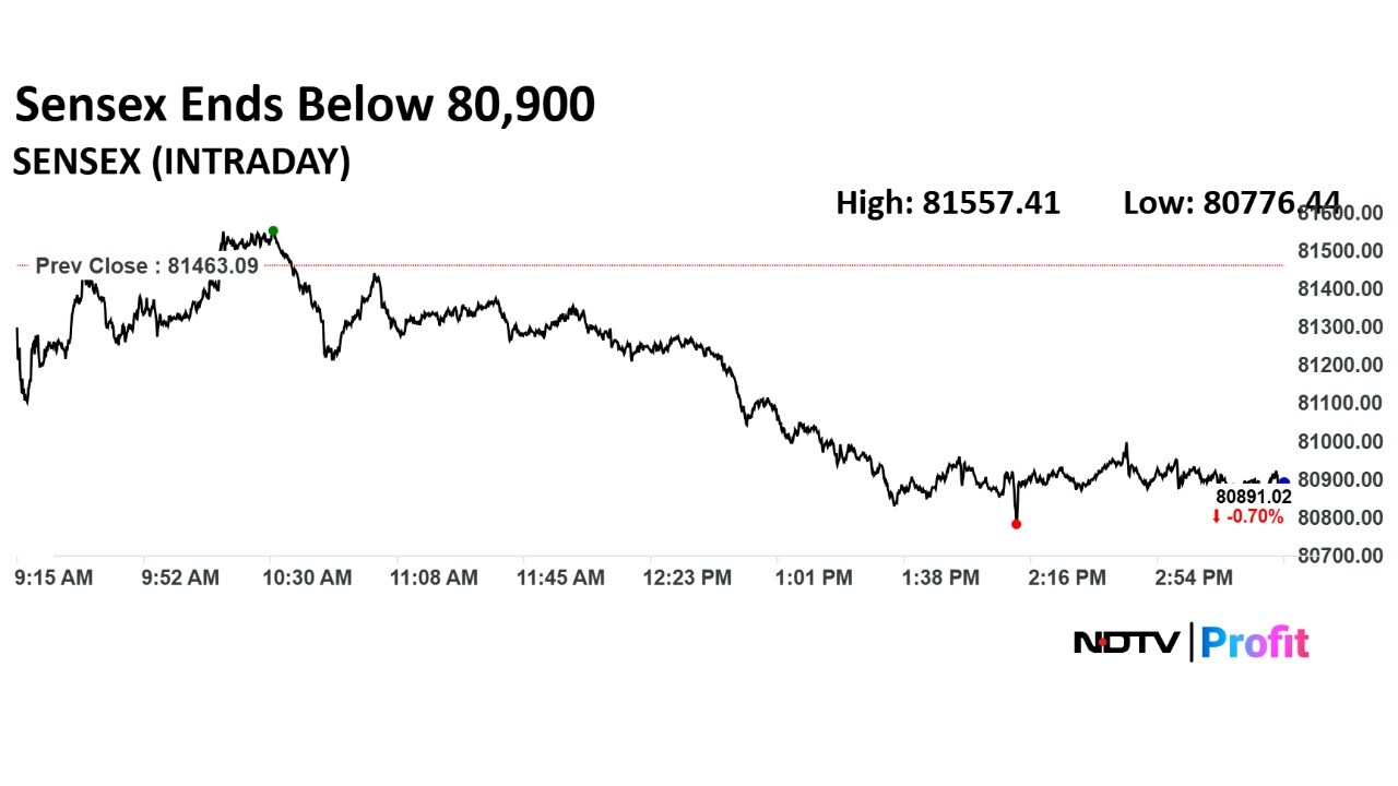 The NSE Nifty 50 settled 156.1 points or 0.63% lower at 24,680.9, while the BSE Sensex shed 572.07 points or 0.7% to close at 80,891.02.