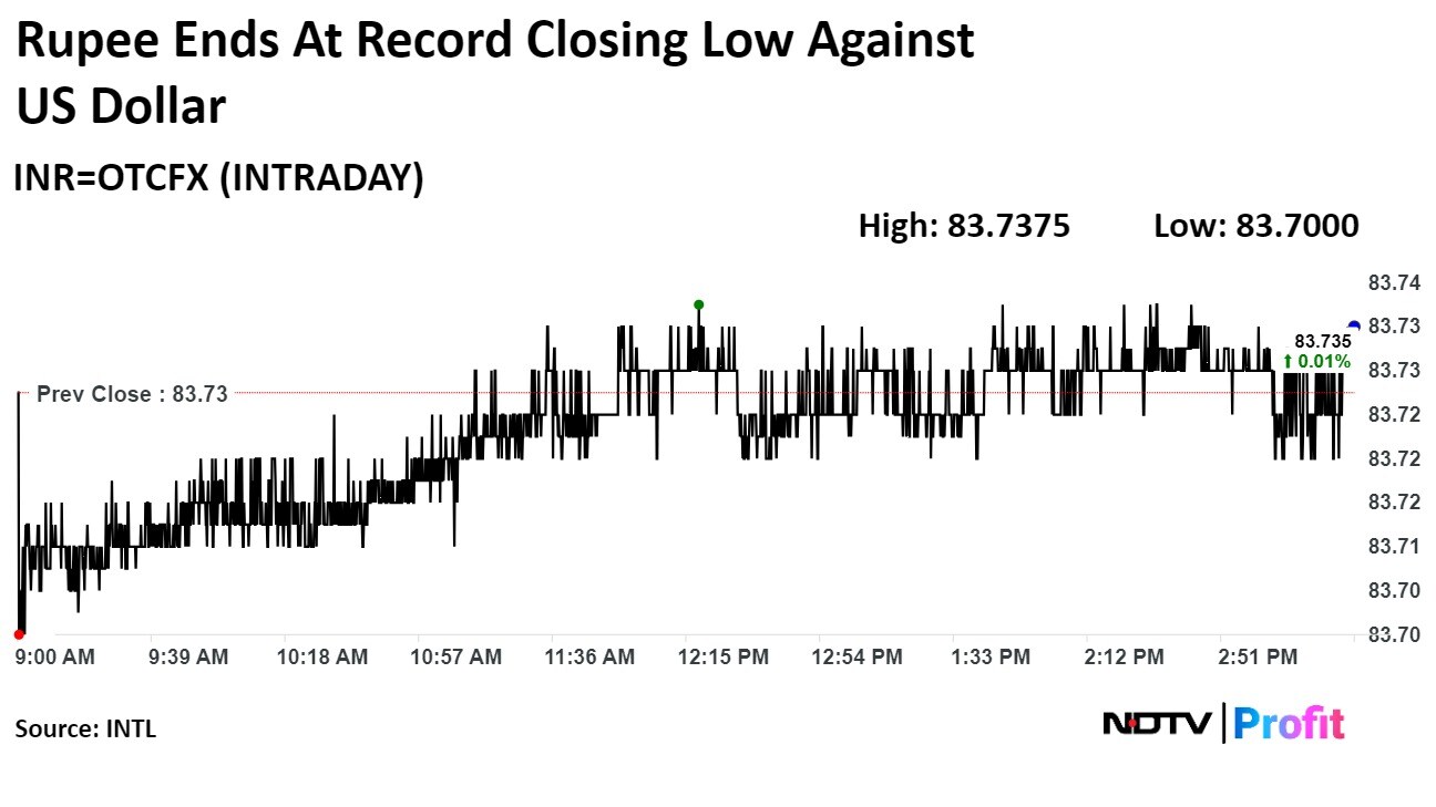 The local currency weakened one paisa to close at Rs 83.73 against the greenback. It had closed at Rs 83.72 on Friday.