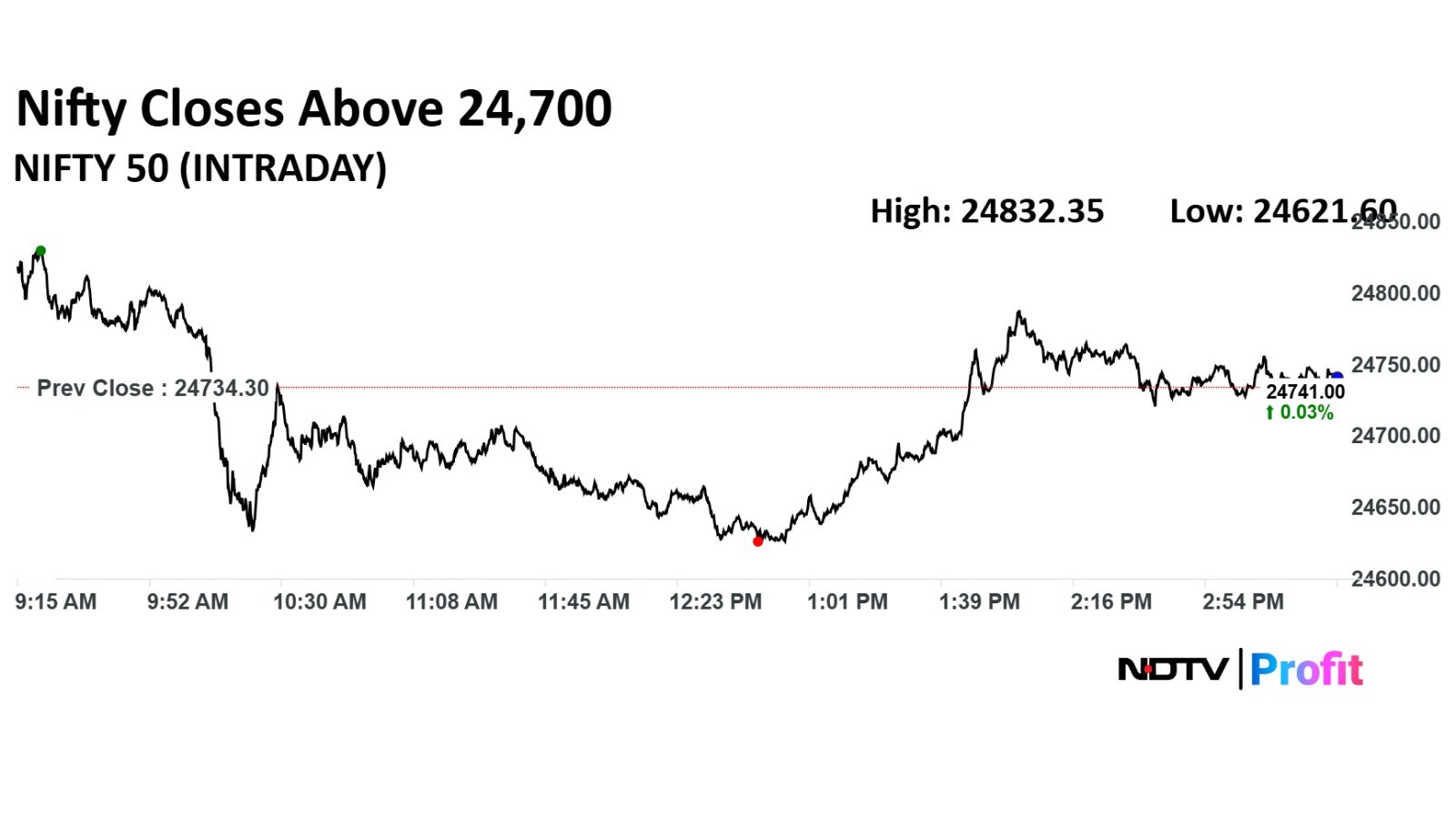 The NSE Nifty 50 settled 6.7 points or 0.03% higher at 24,741 and the BSE Sensex closed 7.25 points or 0.01% lower at 80,710.76 on Friday. The Nifty fell much as 0.46% during the day, while the Sensex dropped 0.49%
