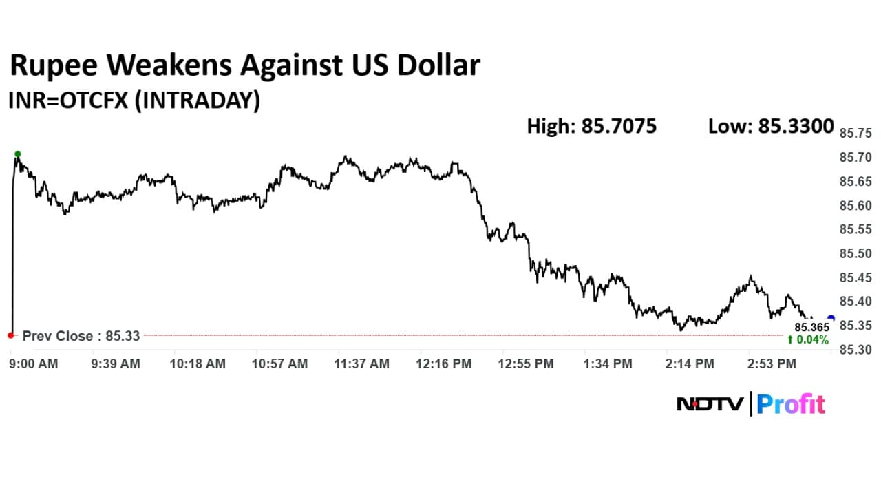 The Indian rupee weakened by 3 paise to close at 85.37 against the US dollar on Wednesday, extending its fall for the second day, in comparison to its previous close of 85.33 on Tuesday.