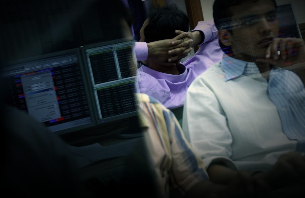 A stock broker reacts during market hours in a dealing room in Mumbai. (Photographer: Prashanth Vishwanathan/Bloomberg News)