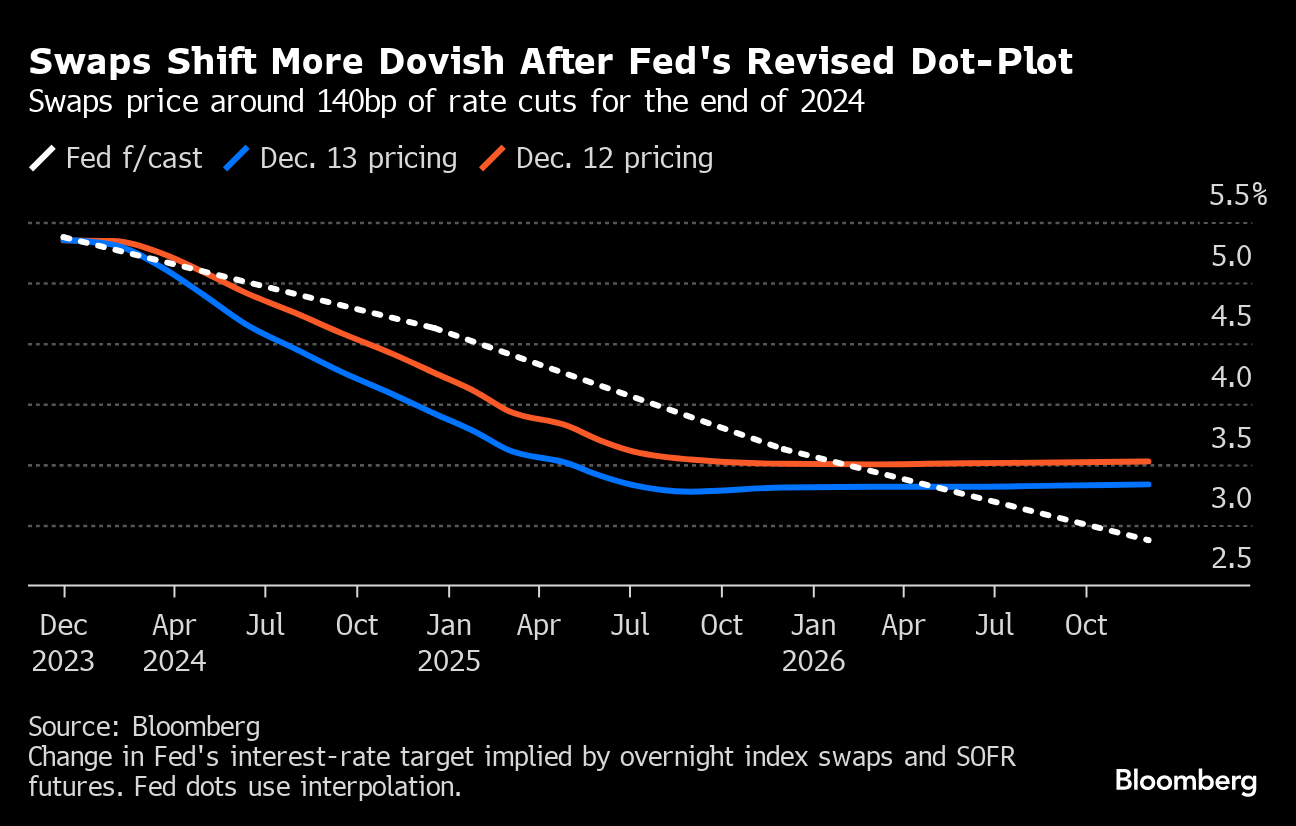 Following their last meeting of the year, Fed policy makers published new quarterly forecasts for the overnight lending rate they control, while leaving their target range for the rate unchanged at 5.25%-5.5%. The median forecast for the end of next year was 4.625%, compared with a median of 5.125% in September. Fed swap rates that anticipate policy changes repriced to levels consistent with more than 140 basis points of easing, up from about 113 basis points before the meeting.