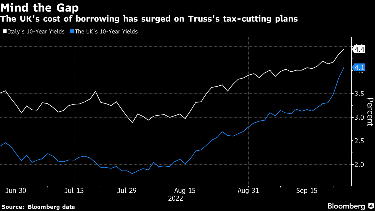 The pound dropped as much as 3.7% against the single currency during Asian trading hours and was 1% lower at 1.1088 euros at 09:13 a.m. in London. The yield on 10-year gilts jumped 29.4 basis points to 4.12% while that on similarly dated Italian debt rose 9 basis points to 4.43%.