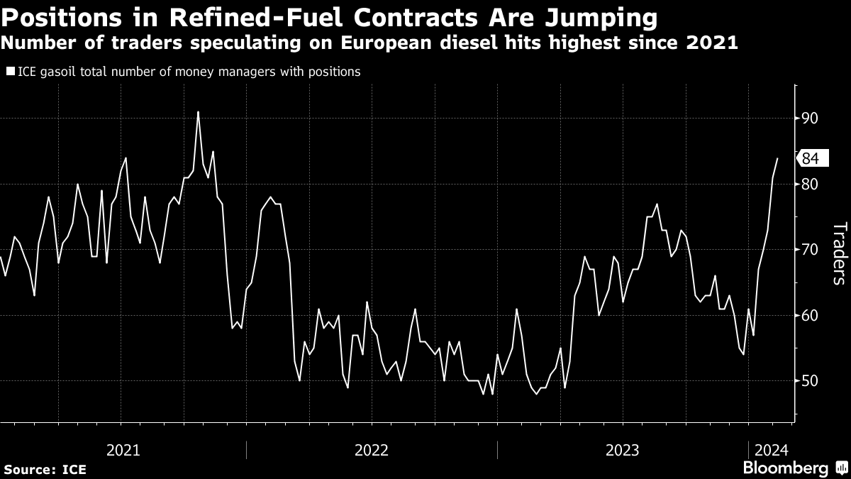 The number of money managers holding positions in Europe's benchmark diesel contract rose to the most since 2021 last week, and the US diesel contract also achieved a similar milestone.