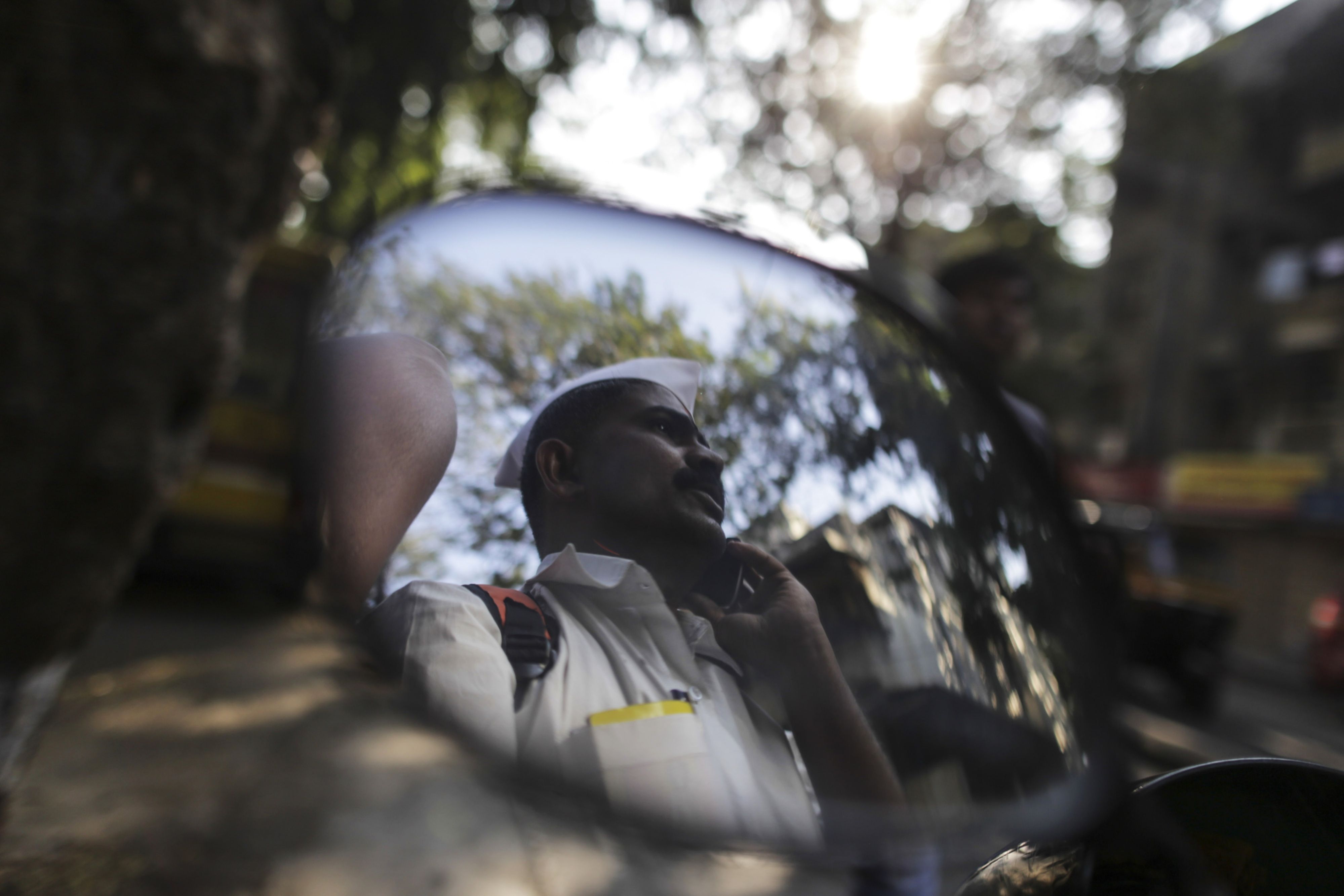 A dabbawala is seen reflected in the wing mirror of his motorcycle as he talks on a mobile phone in Mumbai. (Photographer: Dhiraj Singh/Bloomberg)