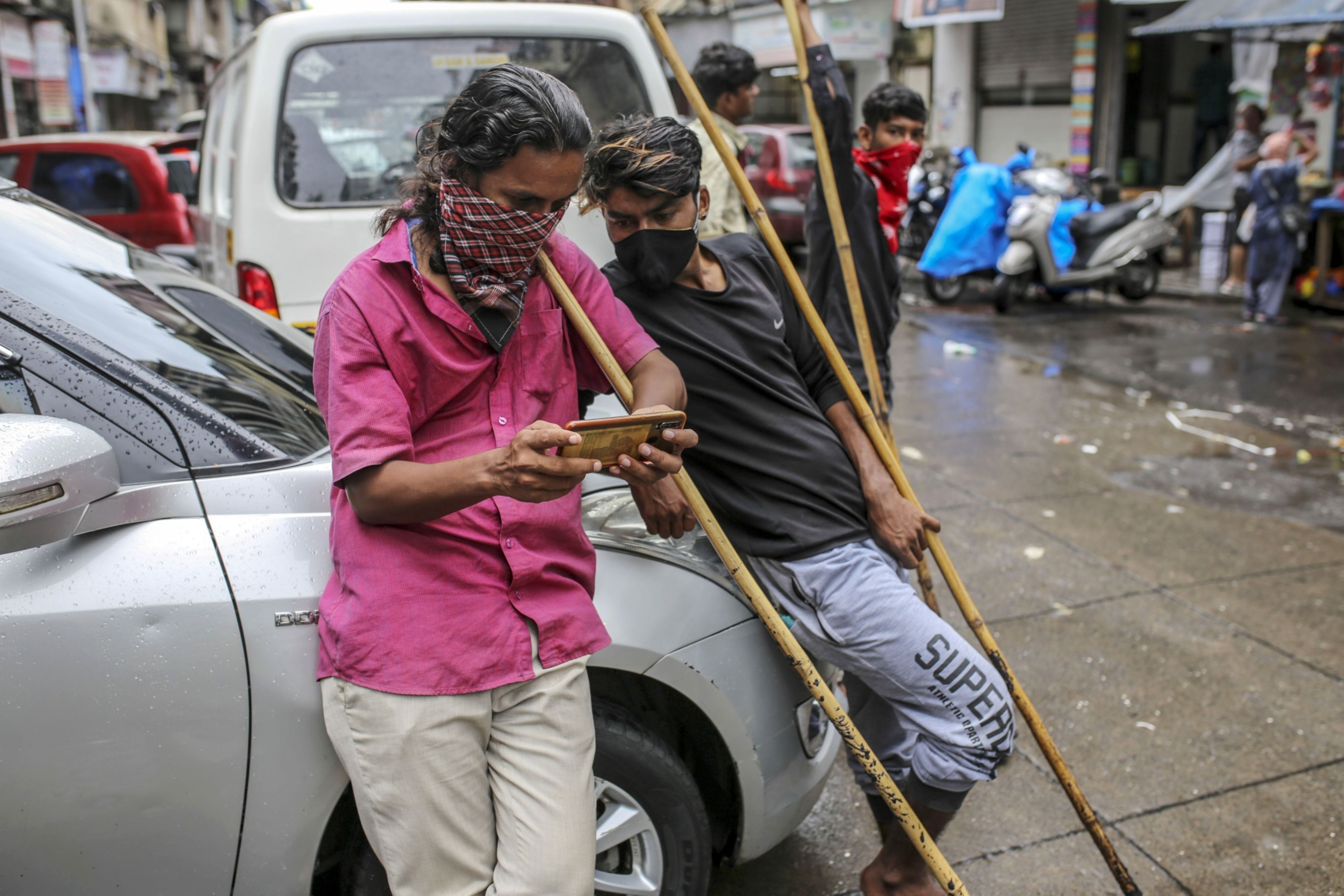Daily laborers wearing face coverings and protective masks look at a mobile phone while waiting for work in Mumbai. (Photographer: Dhiraj Singh/Bloomberg)