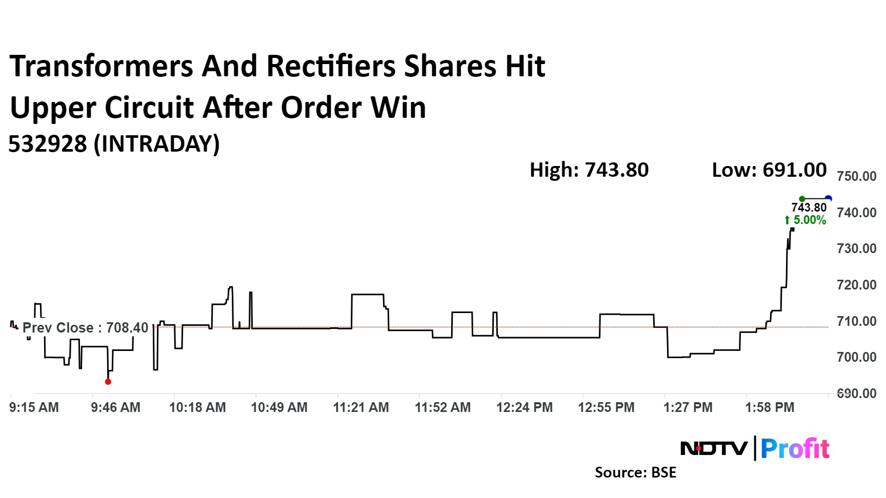 Shares of Transformers And Rectifiers (India) Ltd. hit the 5% upper circuit on Friday after it won orders totalling Rs 252 crore. The company received a deal worth Rs 91 crore from SPIL for supply of transformers with a range of 50 to 500 megavolt amperes and 33 kilovatt class to 420 kV class. It also won an order worth Rs 91 crore from Jindal Steel & Power Ltd. for transformers with a range of 250 MVA and 400 kV class.