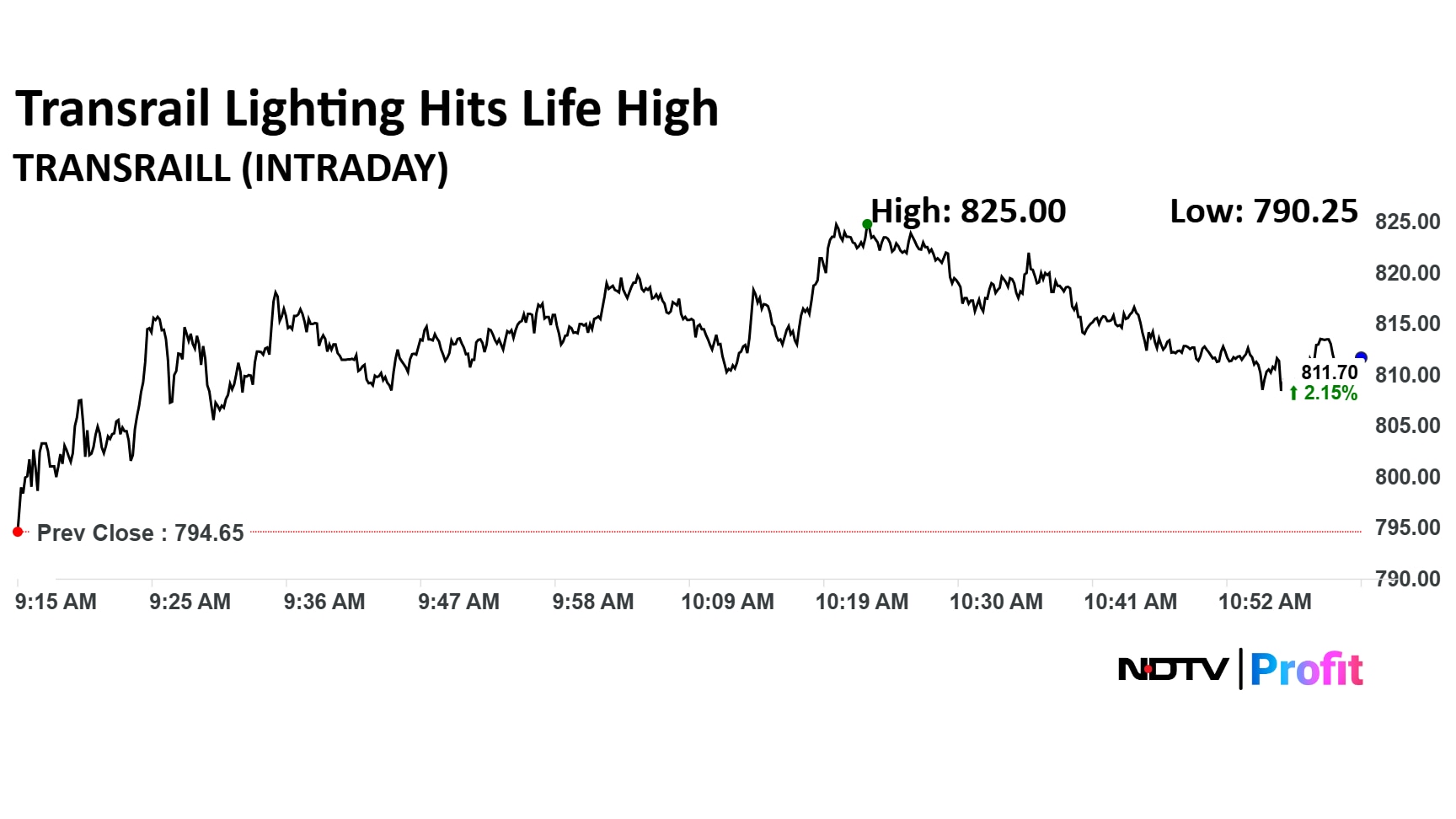Transrail Lighting share price advanced 3.28% to a record high of Rs 825 apiece. It was trading 2.37% higher at Rs 813.3 apiece as of 11:00 a.m., as compared to 0.60% decline in the NSE Nifty 50 index.