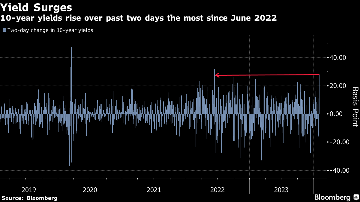 Yields on 10-year notes jumped 28 basis points since Friday, the most since June 2022, after stronger-than-expected data and a service-sector survey that reinforced the Fed's message that interest-rate cuts are unlikely to begin before May. In the futures market, there has been heavy liquidation of long positions in five- and 10-year contracts, as pricing of a March rate cut faded fast.