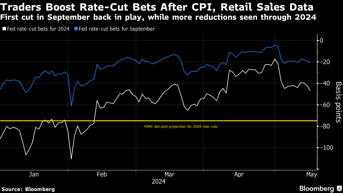 (Bloomberg) -- Treasuries rallied, sending 10-year yields to the lowest in more than a month, after benign inflation data and a weaker-than-expected retail sales figure prompted traders to boost expectations for the Federal Reserve to cut interest rates this year.