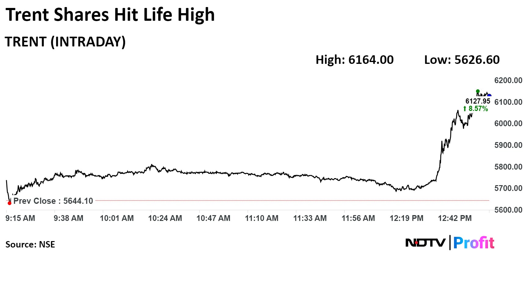 Shares of Trent rose as much as 9.57% before paring gains to trade 9.05% higher at Rs 6,182.10 apiece as of 1:08 p.m. This compares to a 0.96% rise in the NSE Nifty 50.