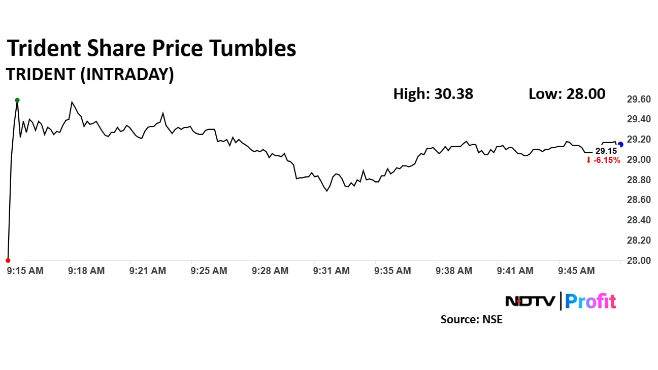 Trident share price declined 9.85% to Rs 28.00, the lowest level since April 5, 2023. It pared losses to trade 6.15% lower at Rs 29.15 apiece as of 9:56 a.m., as compared to 0.54% decline in the NSE Nifty 50 index.