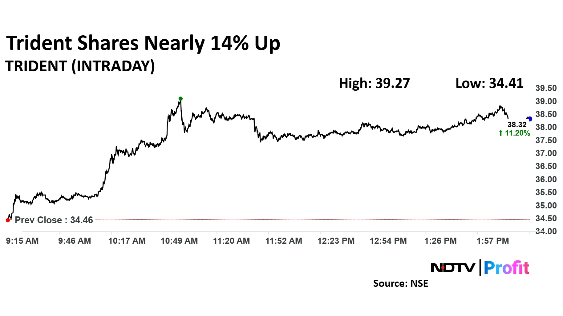 Trident Ltd.'s share price witnessed a 14% rise intraday following Chairman Rajinder Gupta's announcement of fresh investment plans of an additional Rs 3,000 crore in Madhya Pradesh's textile sector, while speaking at the Invest Madhya Pradesh: Regional Industry Conclave in Narmadapuram.