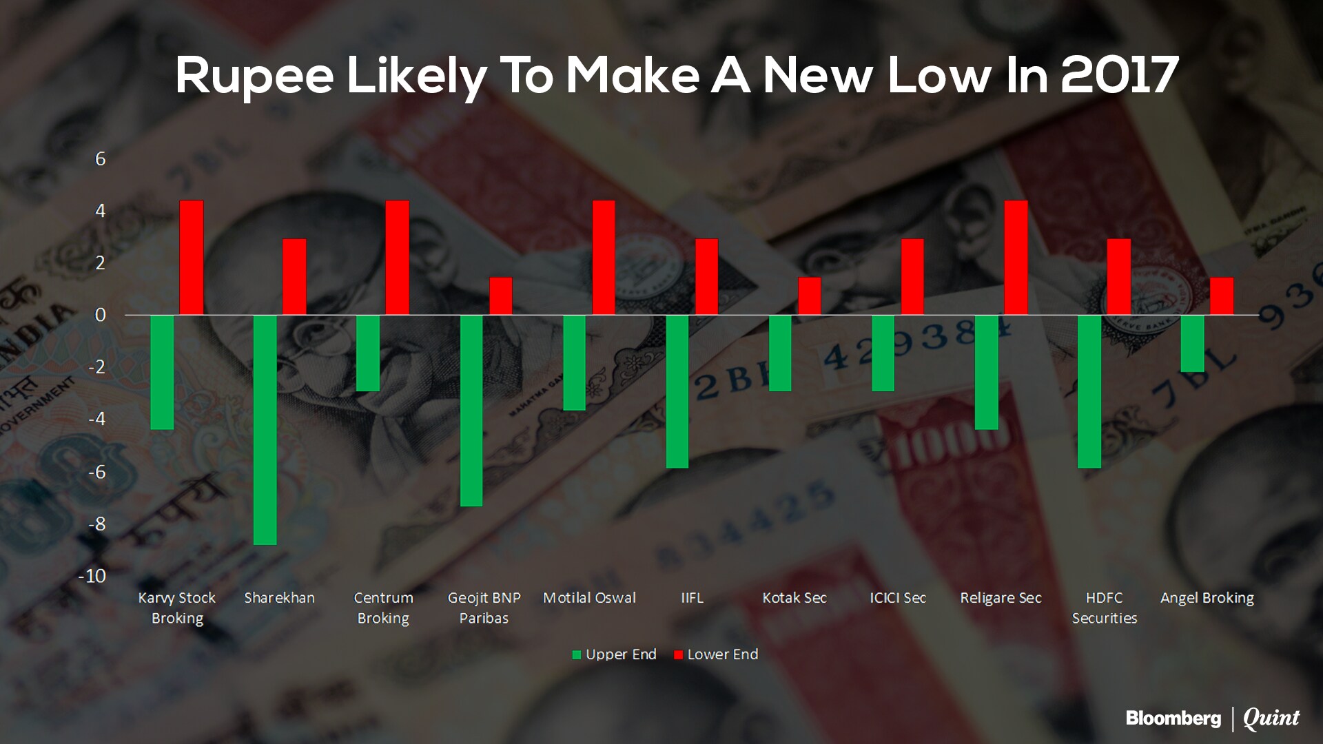 The Indian currency is expected to weaken further, with almost all brokerage houses expecting the rupee to breach the 70 to a dollar mark in 2017. The median forecast for the rupee stood at 71.18 to the U.S. dollar.
