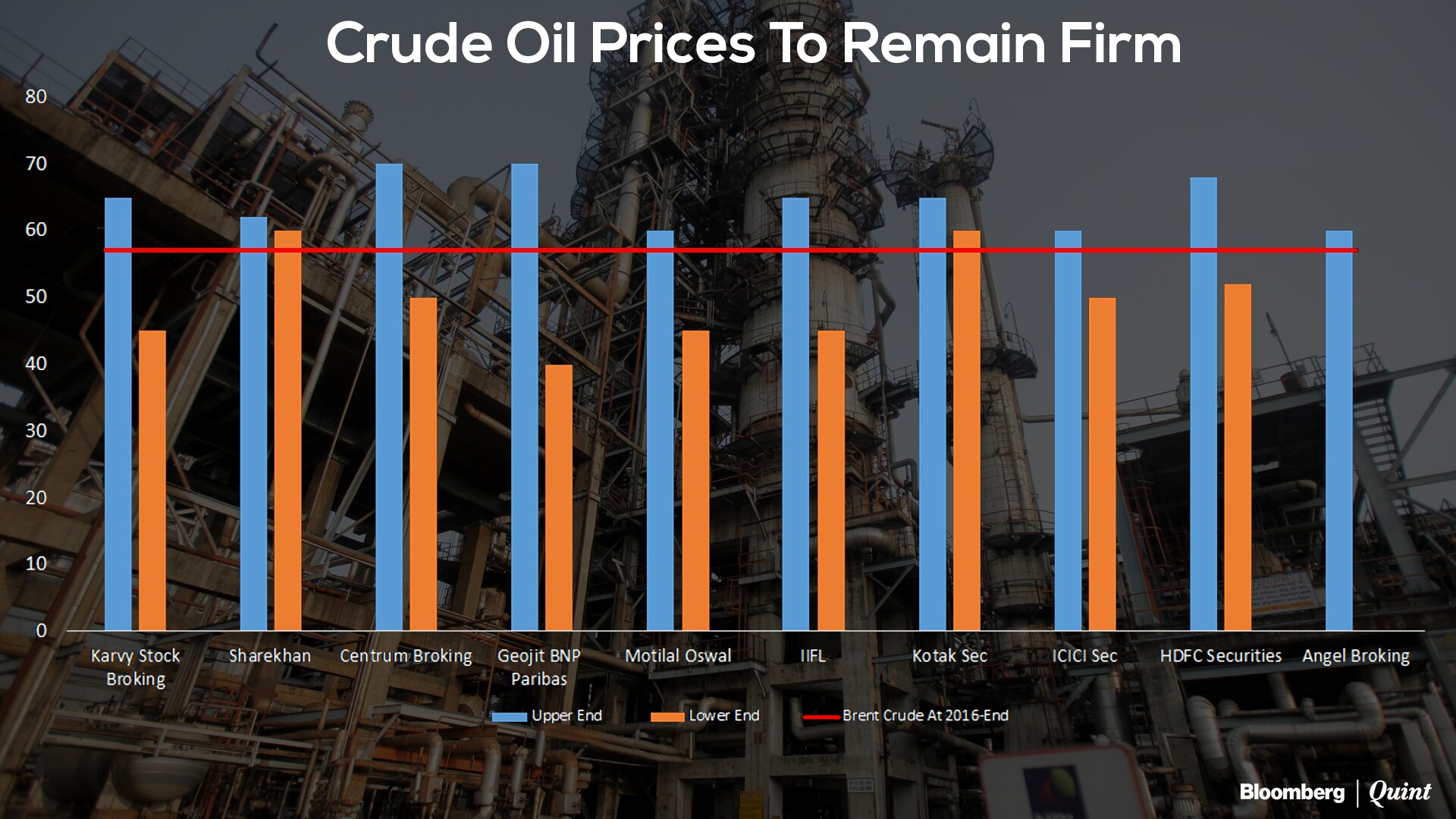 Crude prices are expected to stay firmly above the $50 per barrel mark, with at least two brokerages expecting prices to rise above $60 per barrel. The most bearish call is for crude to fall to $49.6 per barrel in 2017.