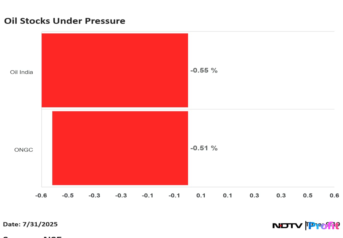 Shares of Oil and Natural Gas Corporation (ONGC) and Oil India declined on Thursday, in line with broader market sentiment which turned cautious following U.S. President Donald Trump's announcement of a steep 25% tariff on Indian exports.
