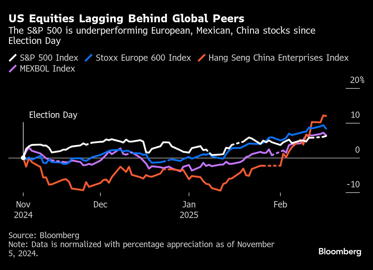 A month into President Donald Trump’s second term, the S&P 500 Index’s record run has still left it trailing European, Chinese and Mexican benchmarks. (Image source: Bloomberg)