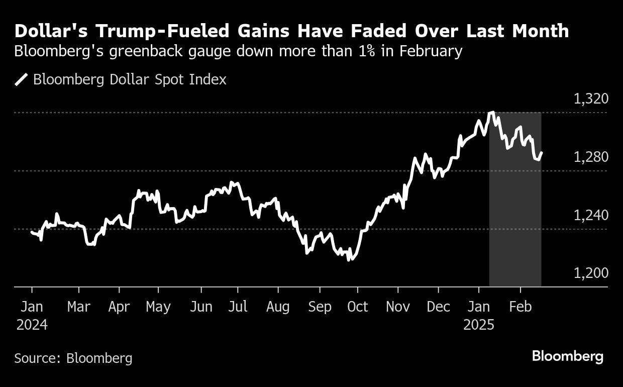 What had been the strongest macro expression of the Trump trade — going long the dollar, in part on the view that tariffs would reignite inflation and drive up US bond yields — has withered. The Bloomberg Dollar Spot Index gained roughly 4.5% from Election Day through Jan. 15. But since then, it's down about 1.5%.