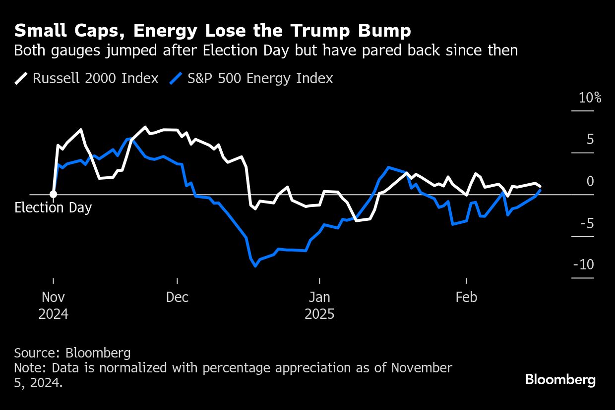 Investors bet that these companies, which are typically more domestic-focused, would be among the primary beneficiaries of an administration that wanted to boost the economy and protect local businesses with tariffs. The day after the vote, the Russell 2000 Index of small-cap shares surged 5.8%, its biggest gain in three years. Yet by the end of November it had peaked, and it's now roughly 1% above its Nov. 5 close.