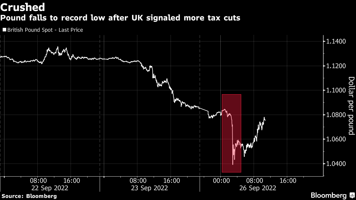 The latest tumble -- fueled by Chancellor Kwasi Kwarteng's comment on Sunday that there's “more to come” on tax cuts -- prompted calls for aggressive rate hikes from the Bank of England, with some urging emergency action as soon as this week.