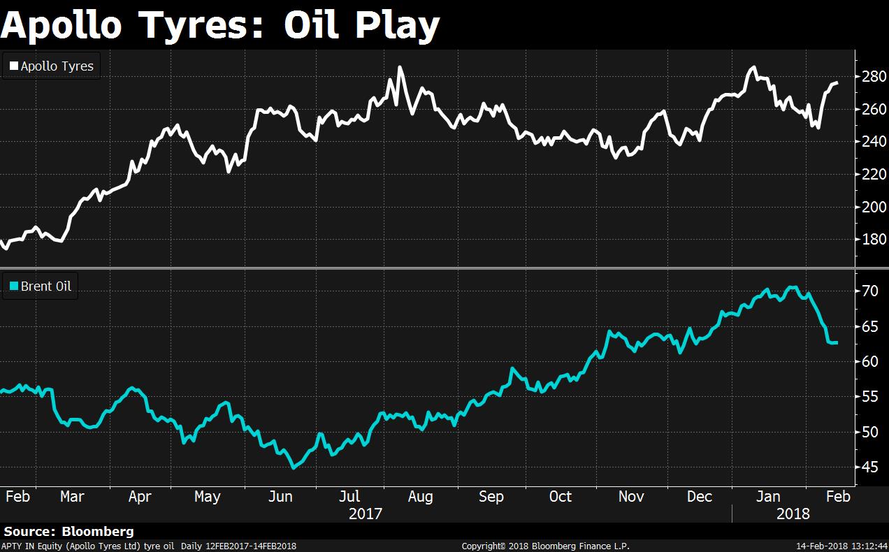 Earlier price hikes also aided the earnings with a lag, with operating margins at their highest in four quarter for all tyremakers. While rubber prices remain soft, the pullback in oil prices should shore up the sentiment. There's a negative correlation between crude and the stock prices of tyre companies (see chart).