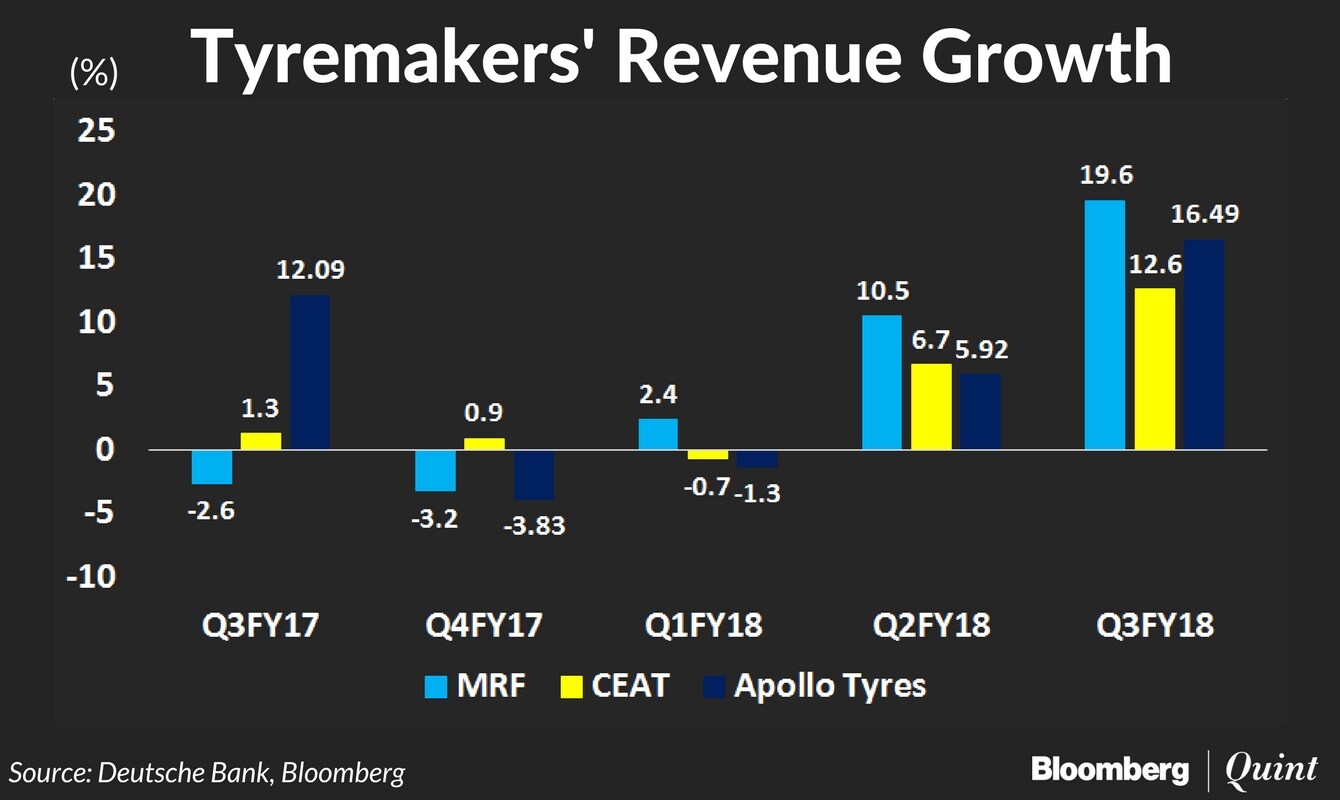 Apollo Tyres' standalone business reported its highest volume growth in at least 12 quarters and CEAT's volumes rose in double-digits after five quarters. MRF's sold 19 percent more tyres during the quarter, continuing with the double-digit growth in the three months ended September.