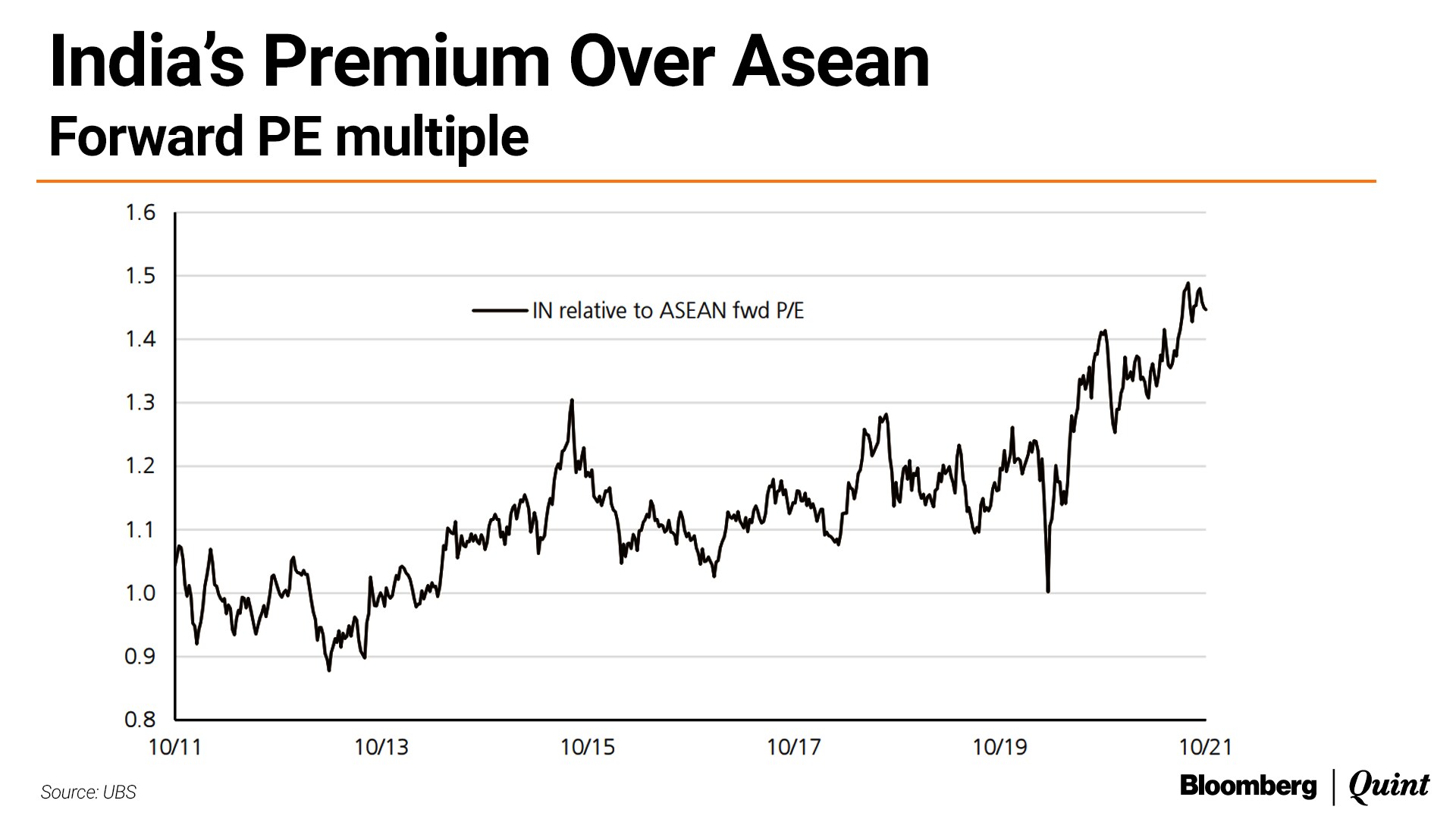 The relative valuation of India to Asean, the two areas with similar growth dynamics and occasional perceived macro vulnerabilities, looks “too wide to justify”, UBS said in an Oct. 20 note. The firm calls India “extremely expensive”.