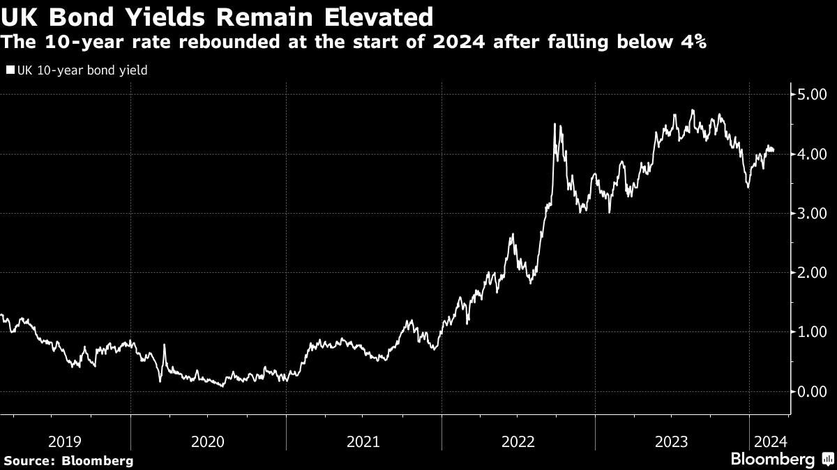 Gilts have had a rocky start to the year, with UK yields rising more than their European and US peers to trade above 4%. Governor Andrew Bailey said last week that bets on rate reductions this year are “not unreasonable,” but added that when and by how much policy is eased depends on further progress being made on tackling sticky inflation.
