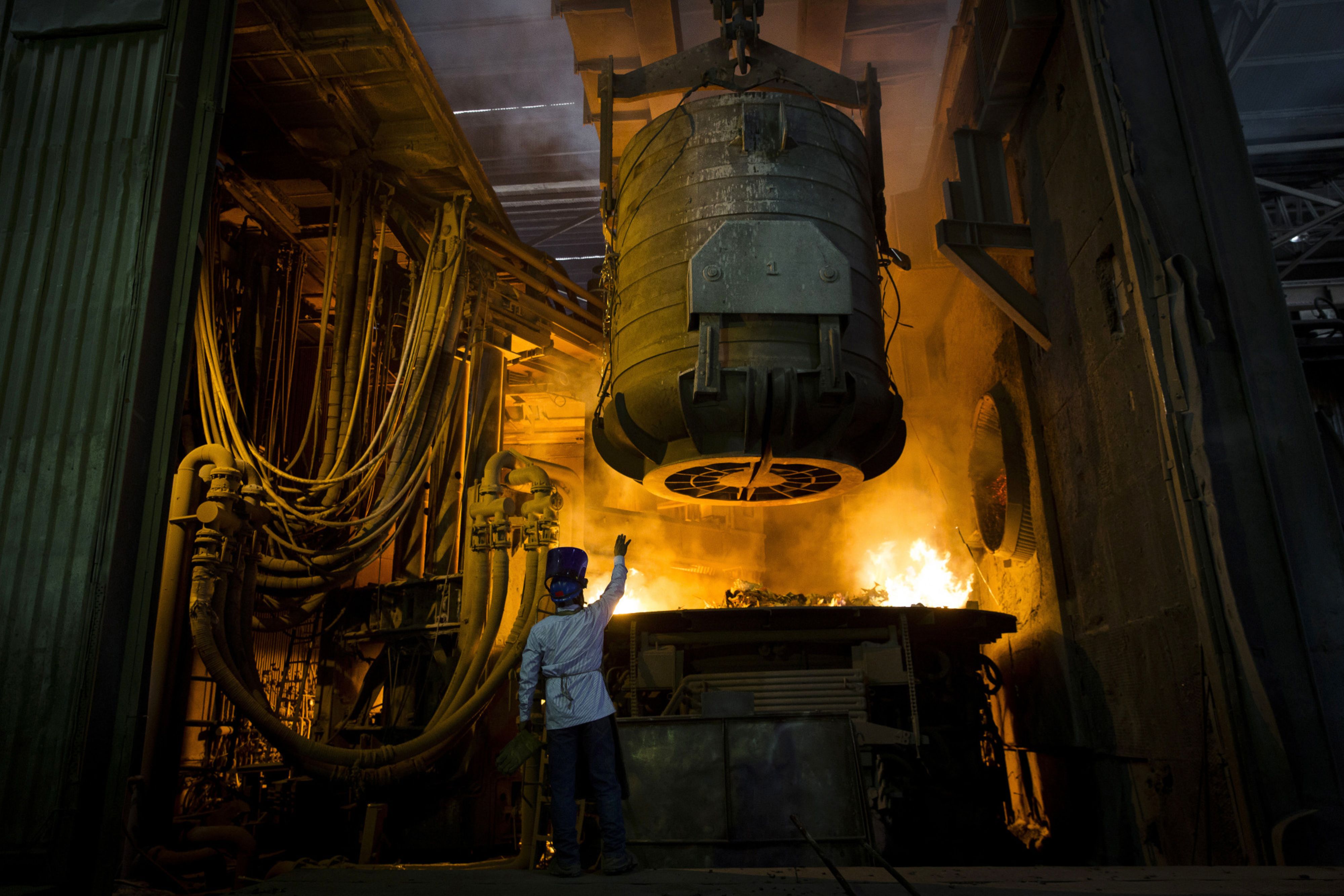 Steel is melted at a furnace in the steel melting shop at a Jindal factory in Haryana. (Photographer: Udit Kulshrestha/Bloomberg)