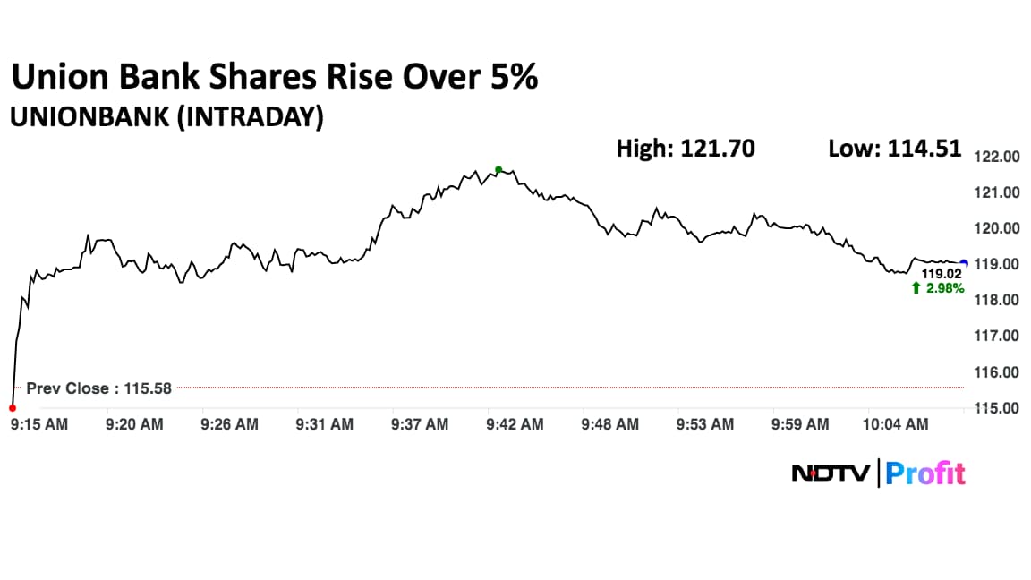 The shares of Union Bank rose as much as 5.30% to Rs 121.70 apiece, the highest level since May 7. It pared gains to trade 3.68% higher at Rs 119.83 apiece as of 10:08 a.m. This compares to a 1.19% decline in the NSE Nifty 50 Index.